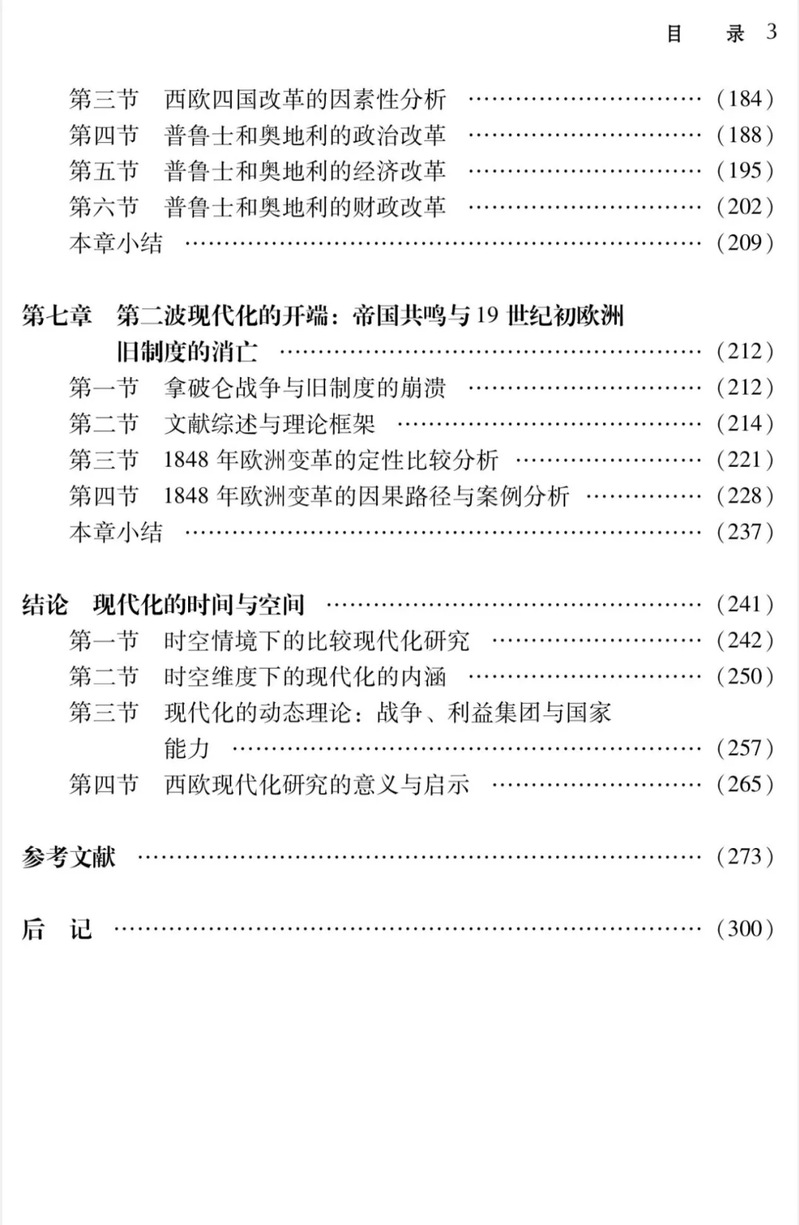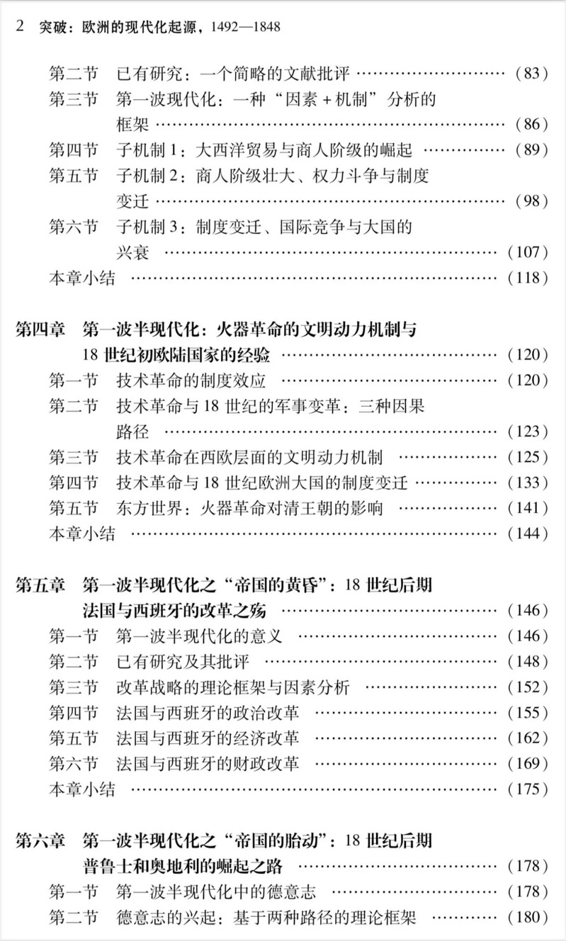 《突破:欧洲的现代化起源》聚焦1492—1848年欧洲现代化进程的分期和特征,试图通过时空视角分析现代化的起源、传播及内在动力。作者对现代化的研究采用了“因素+机制”的分析框架,聚焦外部冲击、国家能力和利益集团三个变量,试图在具体的历史情境下理解现代化的复杂性。这一情况下现代化的机制可以概括为,在外部冲击下,改革派在权力斗争中战胜阻碍改革的利益集团,依靠强大的国家能力高效地实施新政,最终在国际竞争中实现富国强兵。